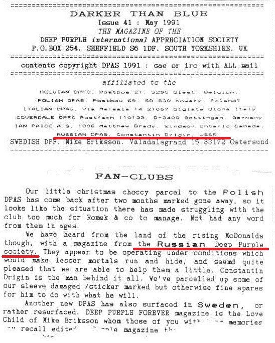 И вот тут, собственно, мы и подошли к тому, о чём давно хотелось рассказать - о советском фан-клубе Deep Purple, который существовал в 80-е годы, в городе Ульяновск. Уже одно это уникально, и на этом "уникальности" отнюдь не заканчиваются. У ребят был свой журнал, регулярный обмен информацией с Саймоном Робинсоном, и даже легендарный Сева Новгородцев поспособствовал в организации клуба и позднее прислал им "Иллюстрированную биографию Deep Purple Криса Чарлзуорта". Если точно, клуб назывался "Deep Purple Russian Fan Section", и заправлял всеми делами Константин Дрыгин. Теперь его черёд рассказывать: